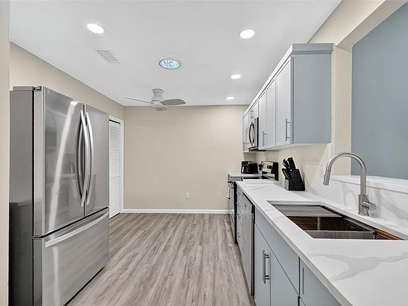 Discover this beautifully remodeled end-unit single-family townhome located in the highly sought-after Woodbridge subdivision of the Country Creek community.Step inside to a fully updated kitchen featuring quartz countertops, new cabinetry, stainless steel appliances, and a washer and dryer. The bathrooms have been refreshed with quartz-top vanities, highline toilets, and modern LED lighting. Every room features new ceiling fans, freshly textured ceilings (goodbye popcorn!), and vinyl plantation shutters. Additional upgrades include Mohawk vinyl flooring throughout, an epoxy-finished two-car garage floor, a well-maintained newer A/C and hot water heater, and a screened-in lanai perfect for relaxing. The home also boasts a 2-year-old roof still under the 7-year warranty and a September 2025 inspection on file. Outside, enjoy low-maintenance landscaping with fresh river rock and clean, subtle foliage. The HOA maintains lawn care, debris removal, and annual power washing, while the community offers impressive amenities including a pool, clubhouse, walking trails, playground, and tennis courts. Just minutes from I-4, Downtown Orlando, shopping, and the SunRail, this home blends convenience with comfort.