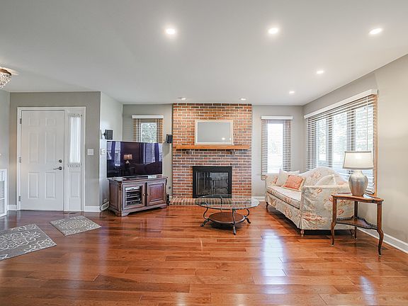 Seldom available ranch end unit in Courts of St. John subdivision. Very rare full basement for tons of storage or finish for extra living space. Many updates throughout. Engineered wood floors (2019). New luxury kitchen with white cabinetry, quartz countertops, SS appliances, farmhouse sink, decorative back splash and under cabinet lighting (2019). New hot water heater (2022). Windows and central a/c believed to be newer. Recessed lighting in living room, dining room & kitchen. Spacious living room with beautiful brick fireplace. Large master suite with bay window and huge 9x6 walk-in closet. Private master bath with tub and separate shower and a newer vanity with double bowl sink and quartz top. Convenient 1st floor laundry room. Nice deck area with grill. 6 panel white door throughout. Great location and truly move-in condition! Estate sale - being sold as-is.