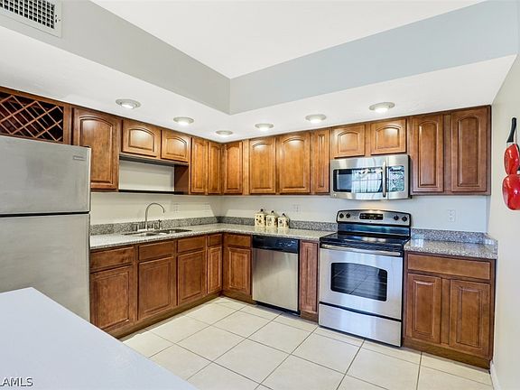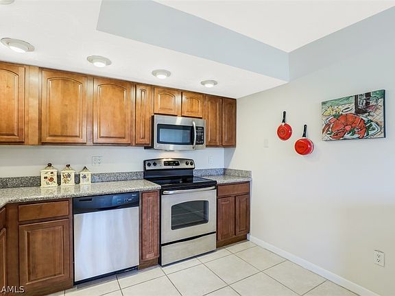This two Bedroom and two full bath condominium has all tile floors, no carpet here, and a gorgeous, updated kitchen including beautiful wood cabinetry, granite counter tops and stainless appliances. The bedrooms are spacious, and the master bedroom has a full bath with large shower, walk in closet, and desk or make-up counter. The laundry area with full size washer and dryer is in the unit and offers additional storage. Sold mostly furnished, including pots and pans, plates, glass etc. All you need is a living room set and dining room set, and you can move right in and start enjoying paradise. This is a great central SW Cape location directly across from Palmetto Pines County Club and it is very close to Pine Island Rd and Veterans Pkwy where you’ll find all the shopping and restaurants choices you’ll need. This small association with community pool is enjoyed by only five other units and your low monthly fees includes water. A new roof is less than a year old and has been fully paid for.