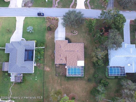 Welcome to your dream home in the highly sought-after Rainbow Woods community of Spring Hill, Florida! This stunning 3-bedroom, 2-bathroom pool home sits on a spacious 0.50-acre lot and offers an unparalleled blend of comfort and style. The beautifully landscaped yard, set on a tranquil cul-de-sac street, beckons with its serene setting, complete with front and rear porches, a screen-enclosed in-ground pool, fenced dog run, and a sprinkler system on a private well. Step inside to discover a thoughtfully designed interior featuring a great room plan with soaring cathedral ceilings that enhance the home's open and airy feel. The heart of the home, a gorgeous kitchen, boasts a breakfast bar perfect for casual dining or entertaining. Enjoy the bright and cheerful Florida Room, ideal for relaxation or hosting guests. With a functional split floor plan, this home ensures privacy and convenience for all residents. The large primary suite is your personal retreat, while the clean and stylish flooring adds a touch of elegance throughout. An inside utility room and an oversized 2-car garage provide ample storage and functionality. Recent updates include a new roof and AC system, both replaced in 2022, offering peace of mind and energy efficiency. This home's prime location offers easy access to schools, shopping, and more, while the beautifully maintained Rainbow Woods community assures a low annual HOA fee of just $150. This exquisite pool home in Rainbow Woods is a must-see and won't last long on the market. Schedule your private showing today!