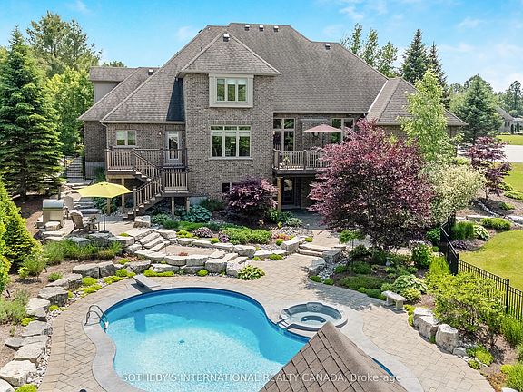 **Priced to sell!!!** The epitome of elegance in this spectacular Charleston built custom home set on arguably the best lot on Taylor Court in the highly desired Brookville community. Incredible backyard retreat with large Cabana w/bath, fire pit, in-ground salt water pool w/spill over spa, lush perennial gardens, beautiful mature trees, & full landscaping all set on 2.25 private acres backing onto the forest. This almost 7000 sqft two storey home offers main floor office, 4+1 large bedrooms with the primary on the main floor, custom Barzotti kitchen w/granite counters, high-end appliances, a prep-kitchen/mudroom/laundry combination, & a fully finished basement with bar. Romantic primary bedroom with stone accent wall, 2-way fireplace, stunning 5 piece ensuite bath, & grand walk-in closet with custom shelving. Vaulted ceiling living room with stone adorned fireplace open to the kitchen with grand island, bar fridge, & Wolf range & sub zero fridge. Lovely breakfast nook with built-in cabinetry & walk-out to deck. Take the open staircase to the second floor which has 3 large bedrooms each with ensuite access. The walk-out basement features multiple recreation rooms, brick fireplace & bar, as well as full 4 piece spa like bath & 5th bedroom. Walk-out to the jaw dropping backyard retreat featuring multiple decks, & beautifully maintained gardens. Triple car garage, circular driveway, exterior lighting, the list goes on & on. Incredible curb appeal on this executive court, one of the largest homes available on Taylor.