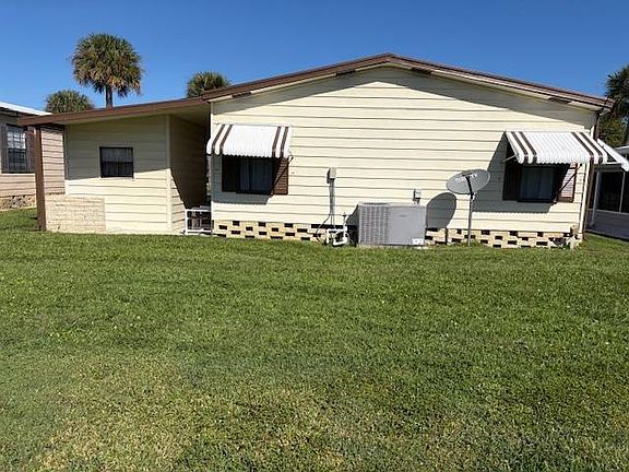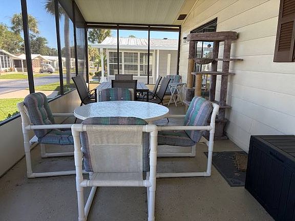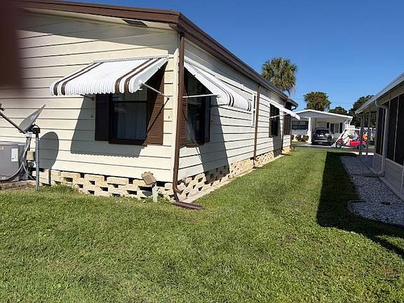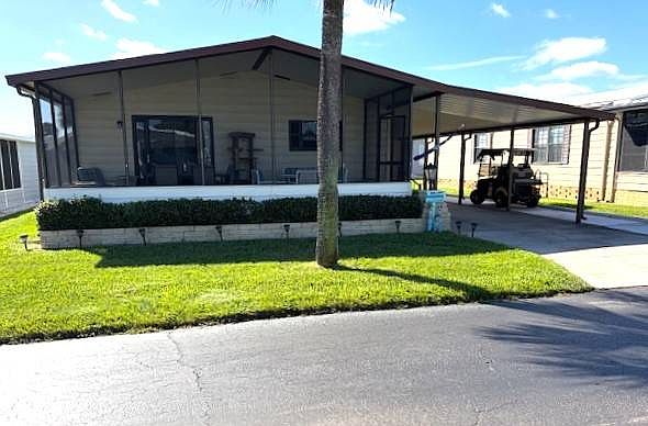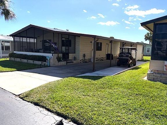 This beautifully maintained 2-bedroom, 2-bathroom home is in perfect condition and completely turn-key-just bring your toothbrush and suitcase! Used only as a winter residence, the home has been meticulously cared for and offers spacious, comfortable rooms for you and your guests. Interior Features: Updated luxury vinyl flooring throughout Remodeled tiled bathrooms High-end kitchen with white wood cabinetry, floor-to-ceiling pantry, and newer stainless steel appliances Bright and open living room with sliding glass doors leading to a house-height screened front porch that spans 28 feet wide, effectively doubling your living space Exterior & Extras: Metal lifetime roof A/C replaced in 2017 8' x 10' attached storage shed Steel-reinforced carport with covered parking for two cars. Beautifully landscaped yard with irrigation from a private well to keep your water bill low. Community Amenities: Enjoy resort-style living in this vibrant 55+ community featuring a large residents' clubhouse filled with activities for everyone, an Olympic-size swimming pool, Jacuzzi, tennis courts, bocce ball, shuffleboard, and plenty of green space for walking your furry friend. Lawn maintenance is included, so you'll have more time for morning bike rides and socializing with your neighbors!