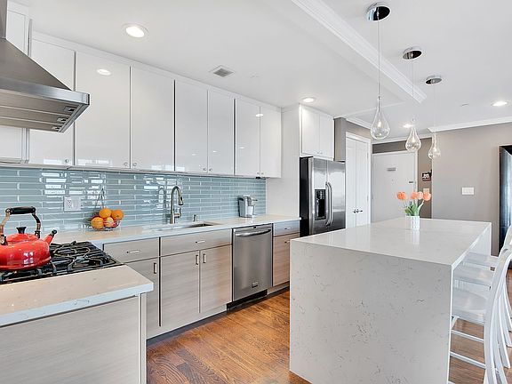 This Top-Floor Corner Penthouse features two bedrooms, two bathrooms, your own Private Roof Top with 360-degree spectacular views, plus Deeded Indoor PARKING! Tastefully redesigned and renovated, this immaculate condo boasts unique customizations. Starting with an open kitchen concept showcasing two-tone cabinetry, glass subway tile backsplash, state of the art appliances including a touch-less sensor faucet and a convection microwave oven hidden under a cascading quartz-countertop breakfast bar. There is ample custom cabinetry storage throughout. Wemo light switch smart technology allows you to schedule kitchen overhead lighting from your phone for your convenience. Additional apartment features include solid oak hardwood floors, recessed LED lighting, center island electrical USB outlets, oversize insulated sound-reducing windows, a full-size washer and vented gas dryer.