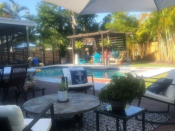 Open concept 3/2 pool home in corner lot. 3 large bedrooms. 2 car garage. Circular driveway. Vaulted ceilings in living area. French doors look out to covered terrace next to the pool and yard. Master opens up to wooden deck overlooking the yard and pool area.