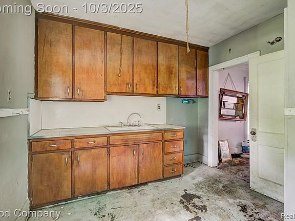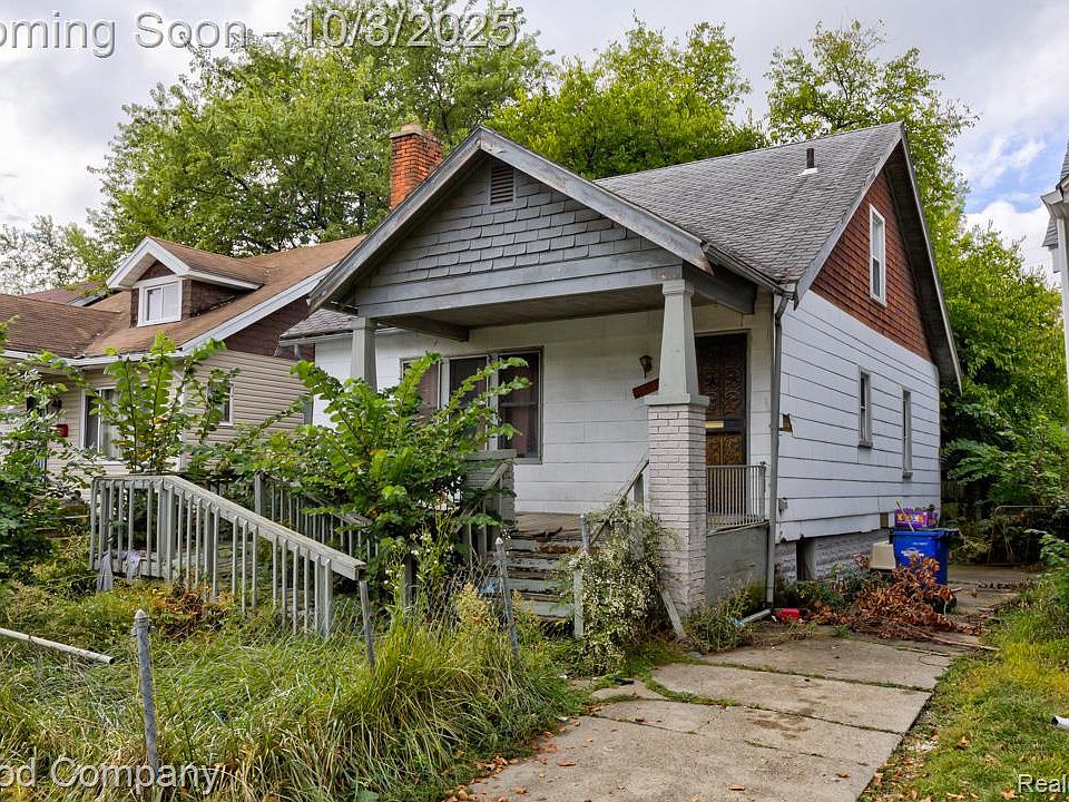 Great investment opportunity in Detroit with tons of potential and original charm waiting to be brought back to life. A classic covered front porch welcomes you into a bright living room featuring hardwood floors, a cozy fireplace, and coved ceilings. The spacious dining room flows into a generously sized kitchen with vintage cabinetry and good natural light. A full bath and one bedroom are located on the main floor, while two additional bedrooms upstairs offer unique character—one showcasing knotty pine paneling and the other with a charming arched sitting nook. The full basement provides plenty of storage or renovation possibilities. Out back, enjoy a deep, shady yard with mature trees and a large rustic shed. Welcome Home!