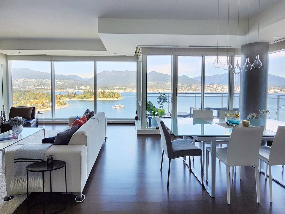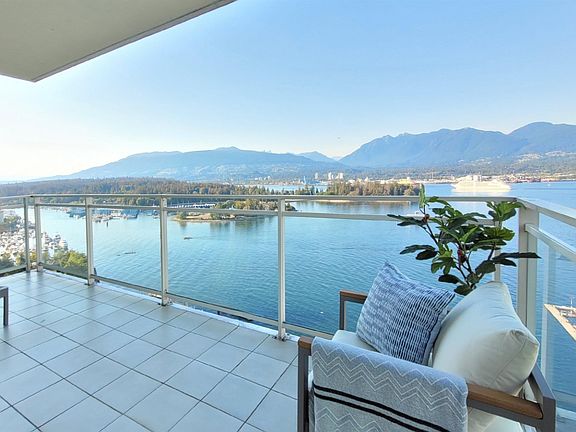 Exclusive sophisticated oceanfront living at award-winning 2Harbor Green in prestigious Coal Harbor.With only 2 units on the floor,the spacious&bright home is at the perfect height;high enough to offer far reaching stunning 180° views, incl Stanley Park, Lions Gate Bridge&2nd Narrows Bridge;yet still has a very intimate feel with the water and greenery. Enjoy sunrises and sunsets from the large private terrace and tranquil water vistas from every main room.Interiors offer designer custom millwork and upgrades,and is in immaculate move-in-ready condition.Rare features:a private 2 car garage with two EV chargers,an extra large parking stall,and 2 concrete storage rooms(225sqft perfect for downsizers).World class amenities: hotel-style lobby,24hr concierge,indoor pool,gym,guest room,etc.