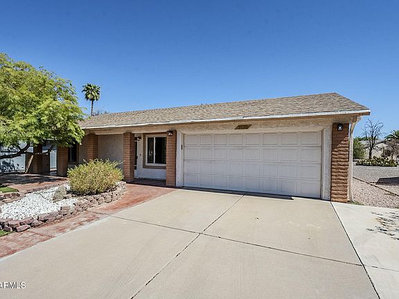 Freshly updated home on a spacious 11,138 SF cul-de-sac lot in Fountain of the Sun. Just completed in September 2025: interior paint, new kitchen countertops and sink. The versatile floor plan features laminate flooring throughout (2019), a primary suite with walk-in closet, and two distinct living areas - one at the front of the home and a comfortable family room off the kitchen. Enjoy the oversized covered patio overlooking an expansive tiled patio area. Additional highlights include a newer roof (2019), updated window and sliding door (2016), and a 2-car garage with storage cabinets and workbench. Fridge, Washer, Dryer included. Low-maintenance front yard with synthetic grass. Exceptional community amenities! This well-maintained 1,284 square foot single-level home features 2 bedrooms and 2 bathrooms on an impressively large 11,138 SF cul-de-sac lot in the established Fountain of the Sun community. Built in 1980, the home has been thoughtfully updated over the years while maintaining its comfortable, functional layout.