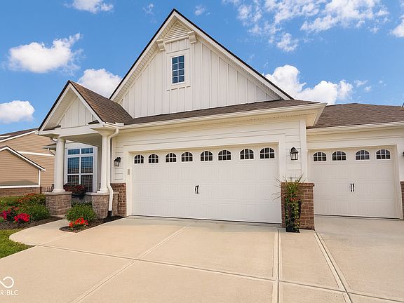 This immaculate 2022-built home in the desirable Merion community offers nearly 2,400 sq. ft. of thoughtfully designed space, all on one level, with 3 bedrooms, a bonus room/office, 2.5 baths, and a generous 3-car garage. Best of all, Merion even offers optional lawncare and snow removal plans, giving you the ease of low-maintenance living without sacrificing space or quality. Inside, fresh paint, luxury vinyl plank flooring, and custom window treatments make this home shine like a model. The gourmet kitchen is the showstopper, featuring quartz counters, GE Profile appliances with double ovens, a large entertainer's island, soft-close cabinetry, backsplash, and updated fixtures. The dining area and great room flow seamlessly together, complete with a cozy gas fireplace and custom mantle. The primary suite delivers a private retreat with walk-in closet, expanded dual vanity, walk-in tile shower, and private water closet. Secondary bedrooms are spacious, with a beautifully appointed Jack-and-Jill bath. Don't miss the oversized storage closet near the secondary bedrooms! Step outside to a covered patio with ceiling fan that feels like an outdoor living room, overlooking a tree-lined yard kept lush by a multi-zone irrigation system. Pride of ownership shines throughout, located just minutes from I-69, Hamilton Town Center, Costco, and Sagamore Golf Club.
