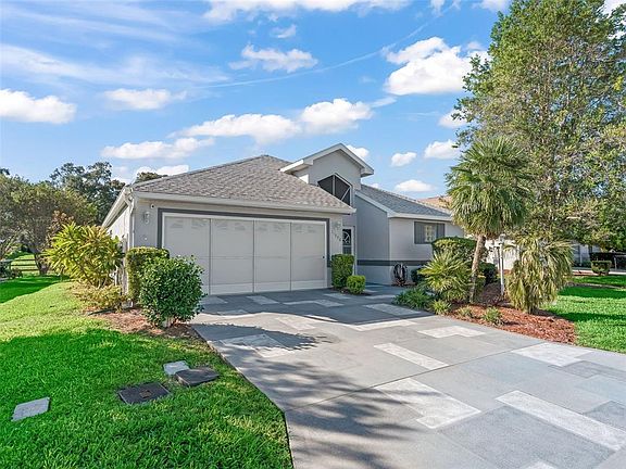 One or more photo(s) has been virtually staged. Stonecrest is a 55+ gated golf course community with all the amenities and 4 pools (one indoor), and just a Bridge Away By Golf Cart To The Villages! Exceptional 3/2.5 Concrete Block & Stucco Sawgrass Casita Villa with an Oversized 2 Car Garage, and Plenty of Privacy, for both the Owner's and their Guests! The Villa's landscaping, mulching, and outside pest control is maintained by the POA ($248.00 monthly). This Sawgrass Casita Villa offers tremendous curb appeal featuring Low Maintenance Professional Landscaping, Painted Concrete Driveway & Walkway, and Double Entry Screen Doors to the Private Birdcage Enclosed Courtyard abundant with Lush Florida Tropical Foliage, Dwarf Palms, Iris, Angel Trumpets, Gardenias, Ferns, Jasmine, Birds of Paradise, and a Serene Rock Garden with Waterfall creating an amazing Private Oasis! This Unique home offers a Fantastic Floor Plan featuring the 3rd Bedroom as the DETACHED CASITA with a Private Entrance, Kitchenette, Closets, Full Bathroom, Television, and a Built-In Murphy Bed! No Carpet! Luxury Vinyl Plank flooring (Waterproof & Fire-Resistant), an Open Concept Floor plan, Vaulted ceilings, Whole house Water Filtration & Softening system (warranty), New Double pane Energy efficient windows & Sliding glass doors, 80 gallon SOLAR Hot Water Heater (warranty), and LED Lighting throughout! The main house showcases a Stunning Kitchen with Reverse Osmosis Pure Water Drinking system, Granite countertops, LG Smart Stainless Double Oven, Stainless LG appliances (warranty), Built in Desk, Generous Breakfast Bar with additional storage, Wood cabinetry with under & over cabinet lighting, and 2 Pantry closets. The Spacious Living & Family areas boast an Alexa Integrated Voice Command Lighted Fans, Alexa-controlled Thermostat, Schlage Front Door Lock, Ring Doorbell with Driveway Camera, Tile Television wall with top of the line Electric Fireplace, New 77" HD 4k Smart TV (warranty), and Vaulted ceilings with additional LED lights! The Luxurious Primary Suite provides Private Entry to the Courtyard, a Large Walk in Closet with Custom Built-Ins, and a Newly Remodeled En Suite Bathroom, featuring a 2 Sink Vanity, Kohler Step-in Tub, and and Expanded Walk in Shower with Rain showerhead, and Body Jets! Bedroom Two features a Nice size built-in closet, Built-In Cabinetry, and Smart TV! Enjoy the convenience of the Inside Laundry room with LG Washtower (warranty)! You will love having plenty of room for storage in the Oversized 2 Car Garage with Insulated Garage Door, Rebuilt Garage Mechanism & Track (9 years on warranty), Work bench, Additional Shelving, Additional Lighting, and SOLAR Attic fan! ROOF 2018, Stonecrest is a 55+ gated golf course community with all the amenities, pools, pickleball courts, softball, 18 hole championship golf course, 2 Fishing Lakes, 2 Dog Parks, Broad Stripes Golf & Social Club and over 90 different clubs to join in the 12,000 sq ft Community Center and separate Crest Club hosting a staffed Computer room with Free classes, arts and crafts and card/gaming areas, a billiards room, a library and a 1200+ video lending library! As a private gated golf course community, you can expect a high level of privacy and security. This Exceptional Sawgrass Casita Villa offers a combination of Tremendous Outdoor Space, Unique Floor Plan, Luxurious Features, a Fantastic Location, and a Secure Community Setting. A WONDERFUL LIFESTYLE AWAITS YOU IN STONECREST!