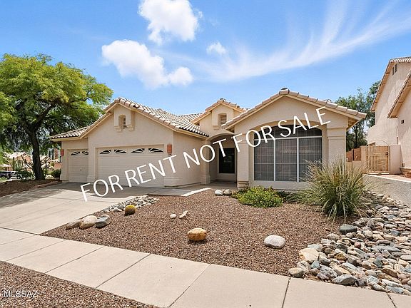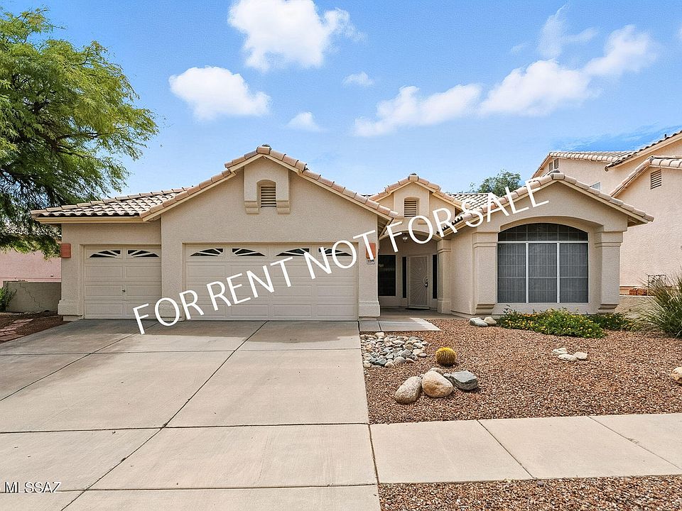 Built 1994, 4 BED 2 BATH 3 CAR GARAGE 2120 sq. ft located in the Copper Creek Neighborhood in Oro Valley. This home boasts an open and airy layout with vaulted ceilings and plenty of natural light. Entry of the home welcomes you into formal living and dining room. Large cozy family room with gas fireplace, perfect for relaxing or entertaining. Kitchen offers an eat- in nook, ample counter and cabinet space. Appliances included: Electric stove/oven, over the range microwave, dishwasher and new refrigerator (to be installed). The home includes a versatile bonus room ideal for a home office, playroom, or den. Spacious master bedroom with ensuite bathroom that includes beautiful double sink vanity, garden tub and walk-in shower, walk in closet. Enjoy Arizona's beautiful weather in the generous backyard with a sparkling swimming pool, perfect for family fun or unwinding with a sunset view. Weekly pool service included. Pets are subject to approval. **Please visit our website for SECURITY DEPOSIT AND OTHER FEES