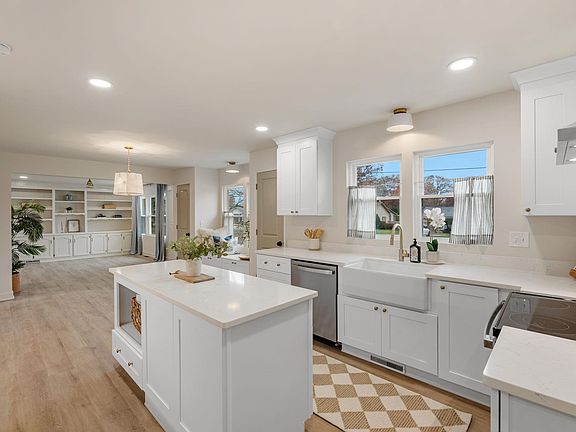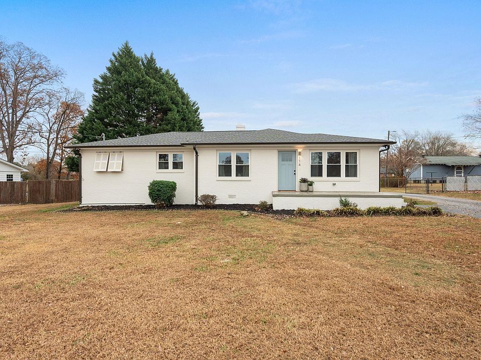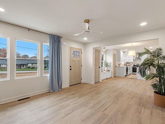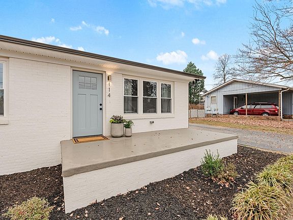 Beautiful, full brick, mid-century ranch with almost HALF AN ACRE. Level, fenced yard, with a detached 2-car garage / workshop. NO HOA, short walking distance to the new, 60 million Sports and Events Center. Opening in 2027. The Sports Center is expected to include an indoor/outdoor walking track, multiple basketball and volleyball courts, community rooms, fitness center, and sports simulators. This home features an open floor plan, with all new windows, updated electric, updated plumbing, and new LVP throughout (with original hardwoods under living and 2 bedrooms). Featuring the Sherwin William's 2026 Color of the Year, Universal Khaki on all interior/exterior doors. Custom built cabinetry and shelving in the living adds so much character. The kitchen features all new soft-close cabinetry, quartz countertops, a prep sink, island, pantry closet, stainless steel appliances, and ceramic apron sink. New interior/exterior doors, new ductwork, new designer lighting, and recessed lighting throughout. All new baths with efficiency toilets, vanities, and mirrors. New laundry closet and lights in all the bedroom closets. The perfect Christmas gift!