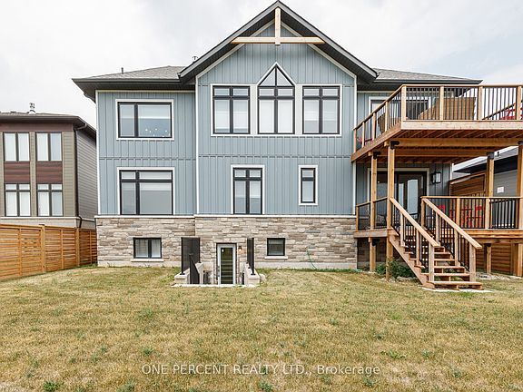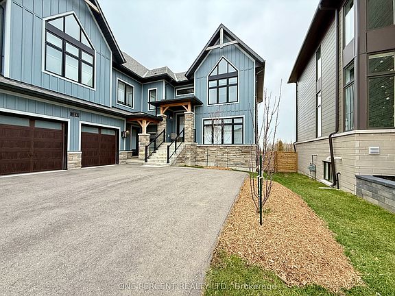 Welcome to 114 Cattail Crescent, a 4,558 sqft mountain house, boasting elegant architectural upgrades, unique stone, fibre cement, and wood grain siding, along with ornamental wood details. A 50-foot wide, side-facing garage creates an impressive street presence, with plenty of parking.This layout features a primary living space (1,883 sqft) on the second floor, additional primary living space on the first floor (1,548 sqft), plus a fully finished walkout basement (1,127sqft). The open second floor, with high ceilings and windows, offers impressive views and features a large deck, custom kitchen, servery, eating area, faux beam covered lodge room, formal dining room, and den, divided by a slate-clad floor-to-ceiling gas fireplace. The expansive owners suite includes cathedral ceilings, a private loggia, spacious walk-in closet, and a beautifully decorated ensuite with standalone tub and a large glass shower enclosure. The main level entrance leads to the main floor with a large bar/kitchen, a family room with a deck, backyard access and beautifully decorated rooms with custom light fixtures. There are also three good-sized bedrooms and two full bathrooms on this level. A separate side door and a garage entrance, leads to a spacious storage room and laundry room. The self-contained basement with glass door walkout, offers a large open space, wet bar, two bedrooms with egress windows, and a full bathroom.The house is beautifully located within a short walking distance to Blue Mountain Village and a complimentary shuttle to many amenities, including the private Blue Mountain Beach. This professionally decorated house with great street presence and exceptional floor plan includes all light fixtures and furniture.