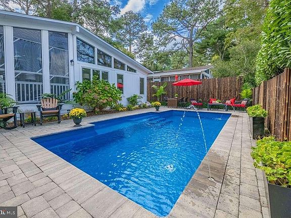 Welcome to Seaside Rendezvous -- This spectacular Key-West style home is truly a seashore oasis located in the coveted north end of Dewey Beach know as Rehoboth by the Sea. This resort hideaway is a one-of-a-kind property featuring a spectacular 12 x 27 heated, in ground private pool with water fall feature surrounded by tropical landscaping with gorgeous palms, seasonal red geraniums and 6 ft privacy fence surrounding the entire property. A large patio with sun lounge chairs and al fresco dining area surround the pool. Relax here, or take a short three minute walk to sink your toes into the sand and the Atlantic Ocean. Many nights you can hear the waves crashing on the large, 12x24 screened porch overlooking the pool and lake just across the street. The home features an open concept great room with living/dining areas with beautiful vaulted wood ceilings, exquisite tongue and groove hardwood floors, updated kitchen and baths, central heat and air conditioning. A wall of floor to ceiling glass separates the porch and great room allowing natural light to flow freely throughout the main rooms. There are two primary suites w/full ensuite baths, one off the great room and one in the new addition (added in 2023). Two additional bedrooms (queen and queen with bunk beds) share a hall bath -- all have vaulted wood ceilings and hardwood floors. There is a small private deck off the rear primary suite. Excellect rental history / summer prime weeks at $15,000 per week. Two off street parking spaces. The home is beautifully designed and decorated - furnishings negotible. This is a Land Lease property with 32 years left on the land lease. Land rent approx. $11,000 annually with increases every five years (not every year). RENTAL INCOME 2024 was $189,000.00 Rent just two weeks and it pays your land lease and most expenses!