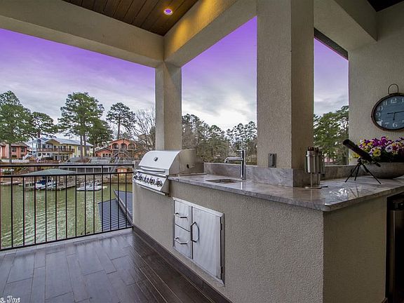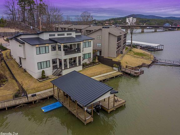 Modern. Lake Hamilton. Luxury. Stunning custom home designed by James Gray, built by Jadee Construction, with interiors by L West Jr Designs. Soaring ceilings and premium finishes contribute to the contemporary elegance of this home. 5 bedroom ensuites are designed to maximize comfort and privacy Master Suite offers patio access and a unique spa bath. Gourmet kitchen features custom cabinetry, large island, and high-end appliances. Stylish modern fireplace warms the living room, while beams add dimension.
