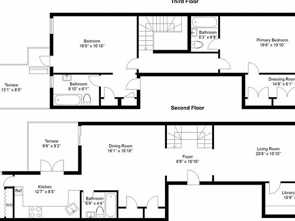Rrenovated duplex townhouse apartment with two private terraces in a coveted location just off Park Avenue on 62nd Street. A formal foyer greets you on the parlor floor and opens to the living room, which features extraordinarily tall windows overlooking a beautiful tree-lined block, a decorative fireplace, 12.5' ceilings and an adjoining windowed library with bookshelves ready to be filled. The beautiful original floors and exquisite millwork continue in the dining room, which can easily accommodate a large table and includes another decorative fireplace and an intricately beamed ceiling. The adjacent sun-filled kitchen offers new Viking appliances and French doors opening to a spacious terrace perfect for outdoor dining. The parlor floor also includes a new, marble full bath situated for use as a powder room and a bedroom (or home office or gym) overlooking the garden. Upstairs, a welcoming landing leads to two large ensuite bedrooms, each with a decorative fireplace. The master bedroom boasts a windowed dressing room with abundant closet space, the second upstairs bedroom opens to a spacious private terrace overlooking the garden, and both bedrooms' marble bathrooms feature Dornbracht faucets. In-unit, full-size, vented W/D. Come home to traditional elegance with modern amenities!