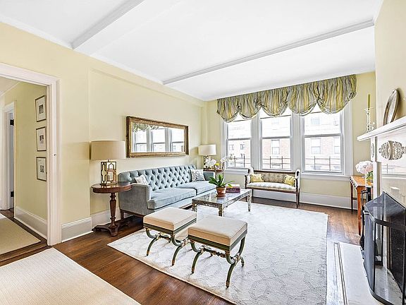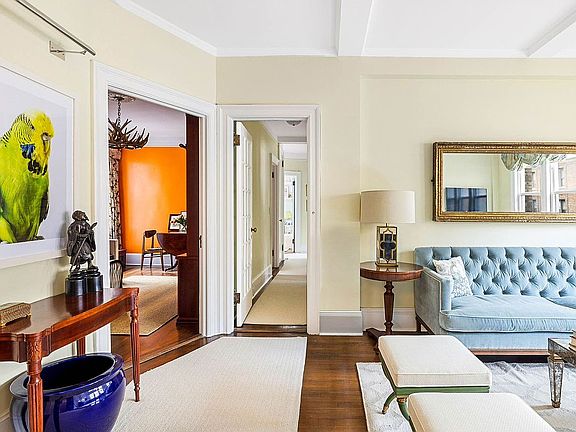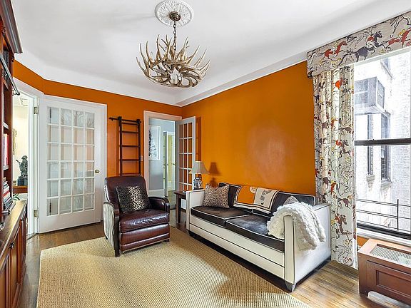 The sun-drenched elegant living room with wood burning fireplace has 9’3” ceilings. The living room, primary suite and 2nd bedroom face north over East 84th Street. The fabulous Hermes orange den and third bedroom face south, receiving abundant natural light. The windowed chef’s kitchen with Caesarstone quartz countertops has elegant cabinetry and top of the line appliances including a washer/dryer. A cozy and cheerful dining area adjacent to the kitchen has an inviting and comfortable atmosphere for meals and gathering.