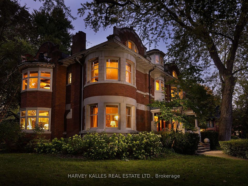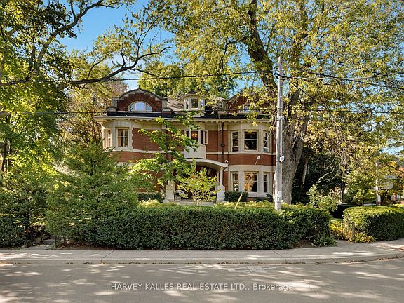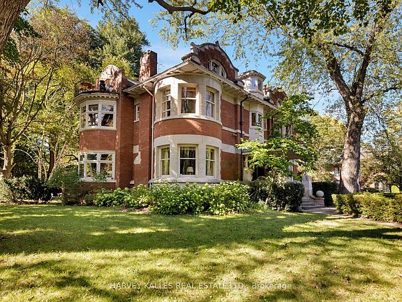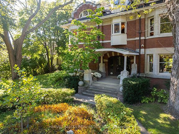 Nestled in Toronto's prestigious Rosedale neighbourhood, this landmark mansion occupies an expansive 100' x 122' estate-sized lot and offers over 7,500 square feet of impeccably designed living spaces. With 7 + 1 generously proportioned bedrooms, 8 bathrooms, and an exceptional third-floor loft, this grand residence seamlessly blends historic architecture with the scale, elegance, and functionality. Originally built circa 1900 for the distinguished Applegate family, the home has been meticulously restored and thoughtfully maintained to preserve it's architectural heritage including a self portrait stain glass window of Mrs. Applegate herself. Drawing inspiration from the classical traditions of Italian Renaissance architect Andrea Palladiio - most notably his iconic Villa Rotunda in Vicenza, Italy - the home reflects timeless design and exceptional craftmanship. A majestic octagonal central hall, framed by twelve lonic columns, creates an unforgettable first impression and sets the tone for the rest of the residence. Throughout the home, rich period details abound: original oak hardwood floors, finely hand-craved oak mouldings and wainscoting, intricate millwork, and 6 fireplaces with decorative tile and brick hearths. The soaring 10-foot ceilings are adorned with ornate plaster crown mouldings, ceiling medallions, and oak-beamed details that speak to the home's historical significance. Expansive bow windows and beautifully preserved stained glass flood the interior with natural light and highlight the warm, elegant atmosphere. Outside, the property is a private oasis, surrounded by mature trees, lush landscaping, and tranquil gardens that offer rare serenity in the heart of the city. A detached two-car garage and additional parking for three vehicles provide added convenience. This is a once-in-a-generation opportunity to own a truly iconic Rosedale residence - an architectural treasure steeped in history and timeless charm.