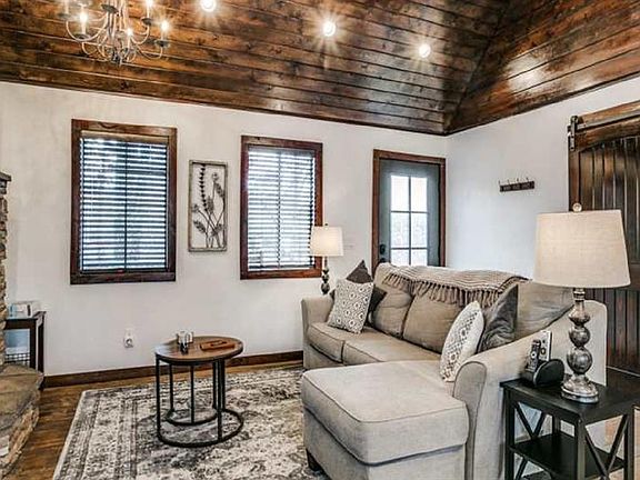 "Greystone Cottage" is a beautiful, cozy cabin that can sleep up to 4 guests comfortably. The gorgeous warm interior finishings throughout the cabin add to the welcoming appeal that guests are sure to love. The cabin is being sold fully furnished and turn-key, ready for the new owners. The open living space provides a fully stocked kitchen, a gas-burning fireplace, and a sectional that converts into a queen bed. The bedroom has a king bed, closet, dresser, and a full bathroom with a walk-in shower. A unique feature to note is the electric fireplace mounted on the bathroom wall, another addition that makes this cabin especially cozy and memorable for guests. Outdoors, you will find a hut tub, a gas grill, a fire pit, and plenty of seating under the covered deck. Greystone Cottage is located close to all major Hochatown attractions and restaurants.