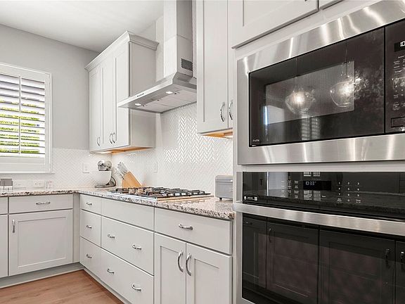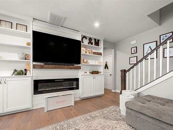The gourmet kitchen is a chef's delight, boasting waterfall granite countertops, an island with a breakfast bar, a gas cooktop, a wall oven, a tiled backsplash, stainless steel appliances, a pantry, and a cozy dining area. The spacious great room is designed for both relaxation and entertainment, featuring a custom built-in with eight shelves, additional cabinetry, and an electric fireplace accented with shiplap and a wood mantel. This unit is complete and move in ready and includes refrigerator, washer and dryer! Complete with a 2 car garage, picnic area, recreation area, sidewalks and walking trail.