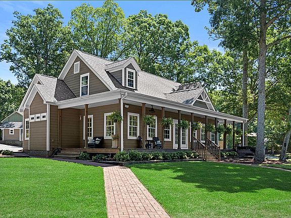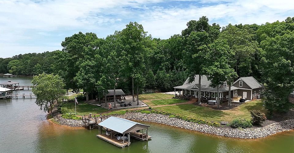 Level & expansive 346' water frontage beckons you lakeside. Host parties in a, tavern-feel, lake pavilion outfitted w/bar top seating, kitchenette w/fridge & roll-up panels for rain/shine use. Space to sit, dance, dine, watch horse shoes or cornhole while overlooking the lake. The pier has a covered boat slip w/lift and sundeck for relaxing by the lake. You can enjoy the shade, and a fire, lakeside under beautiful tree cover or sit on the home’s farmhouse style wraparound porch and hot tub.