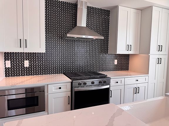with white cabinetry, quartz countertops, and a sleek matte black island. The lavish