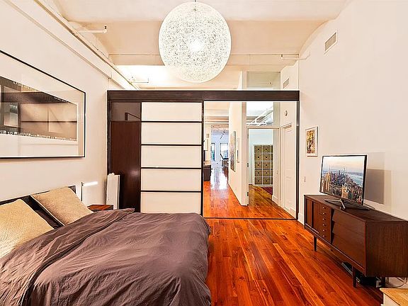 A key locked elevator ushers residents into a windowed foyer with a convenient coat closet. Past the foyer is an expansive great room oversized sash windows and soaring barrel-vaulted ceilings. Exposed ducts and pipes are quintessential industrial touches, while beautiful hardwood floors add warm organic tones.