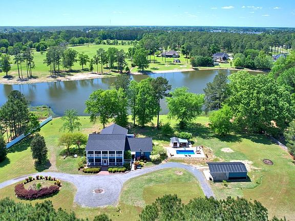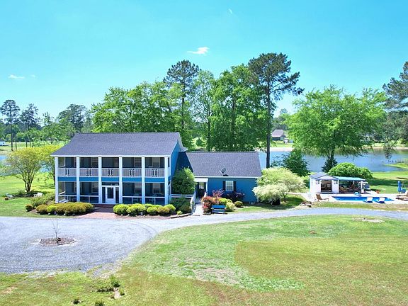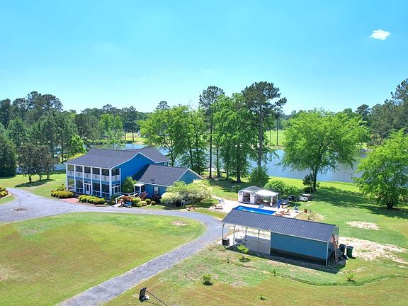 If you're looking for a little bit of PARADISE, this is it!!! Quiet, serene on 5 acres of land with beautiful mature trees for privacy. On the back is a 12-acre pond with private fishing deck and PLENTY of fish! There are 3 large screened in porches to enjoy sunrise and sunset. A beautiful saltwater heated pool. Pool house with attached cabana for relaxing and shade. Detached 2 car carport with plenty of storage and covered parking. The home has 5 bedrooms and 5 bathrooms. A primary suite is on the first floor as well as an optional second primary on the second floor. Also, on the first floor is an additional guest room with a private bath. Upstairs there are two additional bedrooms each with 2 closets and private bathrooms. Entering the home is a BEAUTIFUL tiled foyer that greets you with a clear view through the back of the home to the pond! Formal dining room with built-ins. Gas fireplace centrally located in the living room. An additional living space both upstairs and down with wall-to-wall windows for enjoying the VIEW! The kitchen is large and with TONS of storage and space for a large table seating 8-10 people easily! The refrigerator and stove are 2 years new and energy efficient. The large laundry room has outside access. The home is also wheelchair accessible! This beauty has even MORE amenities than listed here!!! You must come experience this haven for yourself!!! Call us today to schedule a tour!!!
