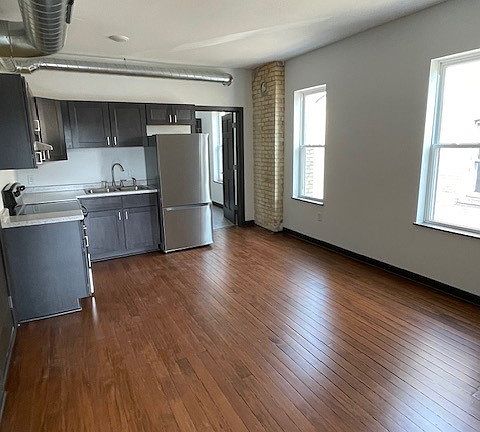 Newly renovated 2-bedroom, upper apartment with in-unit laundry. There is street parking directly in front, and off-street parking in the rear. This apartment has high ceilings and a ton of natural sunlight. There is a retail business below, that is pretty quiet during the day, and not open at night. This apartment is located 1/2 block from the new town square and new library on Main St. There are no pets allowed, so refrain from inquiring. There will be credit, employment, rental history and background checks as part of the application. Showings available on most mornings and select evenings and weekend days.