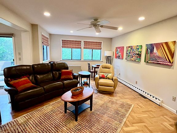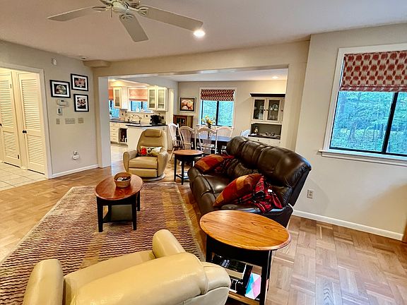 Centrally air conditioned Lookout model. Corner model with easy access. Remodelled kitchen open to dining room and family room. Dining room has slider with remote blind to deck. Privacy & view of woods 2 level oversized deck. Living room has a Rinnai propane heating stove which heats the main level. Lots of recessed lighting & custom blinds throughout. Large laundry area and powder room complete the main level. Primary bedroom has a vaulted ceiling, sitting area and en suite bathroom. It also has a wet bar. Two other bedrooms, each with carpet and ceiling fans plus a second full bath complete the second level. The third level has the fourth bedroom with vaulted ceiling. Located within easy reach of the outdoor pool/tennis courts and the sports field.