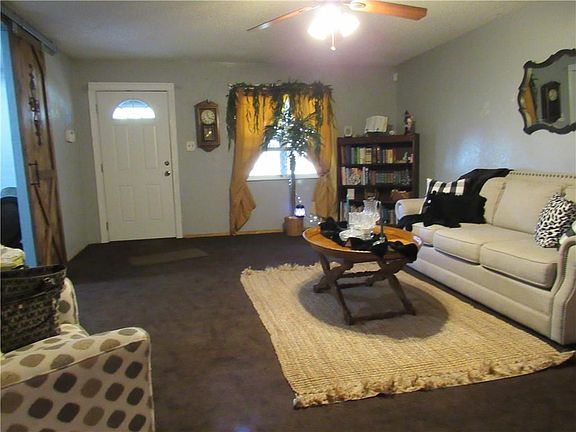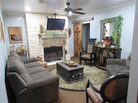 Six lots. Living room with a fan and den with a wood burning fireplace, ceiling fan with light and sliding barn doors at entry. Two baths. Hall bath has one tub/shower and vanity. Second bath has whirlpool tub, copper sink & an additional closet. Kitchen white cabinets, eating bar, gas range, microwave, refrigerator, dishwasher & vent hood. Chair rail in dining area & a door to the covered patio. Laundry room. Entry closet. 3 bedrooms, some have ceiling fans. Fresh interior paint. Backyard has a wood privacy fence, is landscaped a wonderful place to sit and relax. Thermal break fold in windows. The roof is approx. 6 to 7 years old. PSO electric. Rural water. Well on property. Small barn with 2 partitions for horses or livestock. Abundance of storage in the home and room to park you camper, boat and all the extra toys you might have. Large shade tree in the front yard.