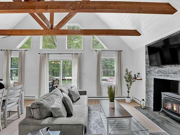 Classic A Frame Chalet with new kitchen, new floors exposed wood beams, pine ceilings, open concept living, cozy propane fireplace, detached 1 car garage, expansive front deck, and hot tub to soak in. Situated on 0.45 acres in short term rental friendly Towamensing Trails. Perfect size vacation retreat for a family or a couple's getaway.