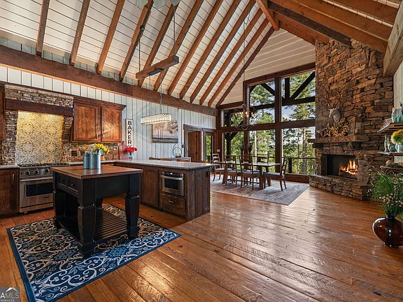 Indulge in this exquisite six-acre mountain estate where privacy, natural beauty, and refined luxury converge. Surrounded by towering trees and sweeping mountain vistas, this turn-key retreat offers tranquility and grandeur at every turn. The spacious residence features four bedrooms and three full baths, thoughtfully designed to blend sophistication with comfort. The main level boasts two primary suites with spa-like en suite baths. One offers walls of windows framing breathtaking views, a walk-in closet, dual vanities, and a custom rock shower with a cascading waterfall. The other showcases a cozy linear fireplace and upscale finishes, ideal for relaxation or hosting. At the heart of the home, the gourmet kitchen is outfitted with Viking appliances, farmhouse sink, custom wood cabinetry, stone accents, and a large island perfect for gatherings. A formal dining area sets the stage for intimate dinners and holiday celebrations. Throughout, rustic charm meets modern elegance-barn wood beams, artisanal accent walls, and rock fireplaces are paired with oversized windows that fill the home with light and mountain panoramas. Outdoor living is just as spectacular. An expansive wrap-around deck captures sunsets and breezes, while the screened porch with fireplace and shaded pergola with hot tub invite year-round enjoyment. The lower level is an entertainer's dream with a full wet bar, recreation room, and two guest suites with a custom rock bath. A sauna, fire pit, and sparkling pool elevate the retreat. Above the two-car garage, a versatile fifth bedroom with private bath offers additional space for guests, office, or studio. Just minutes from Downtown Blue Ridge, with its boutique shopping, fine dining, and outdoor adventures, this estate embodies the best of mountain living-timeless elegance surrounded by unmatched natural splendor.
