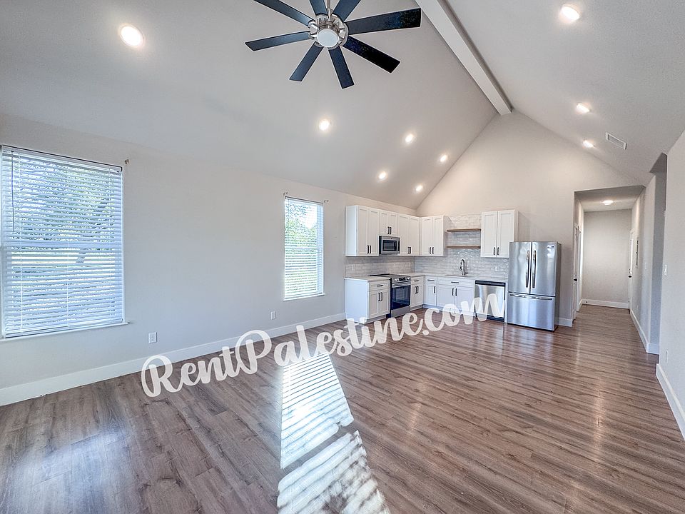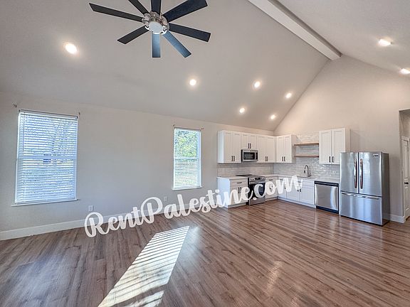 Modern Villa with a quiet country atmosphere only minutes from Loop 256. Newly Built 3 Bed 2 Bath Construction just outside city limits of Palestine! Open concept living/dining kitchen with Granite countertops and custom backsplash in kitchen.Large walk-in pantry. Luxury vinyl plank flooring throughout. All Appliances included: stove, washer/dryer, refrigerator, dishwasher and microwave. Spacious bedrooms. 2 Bathrooms with easy-clean tub/shower combos. Primary bedroom w/ en-suite bathroom and large walk-in closet. Fabulous layout. Covered front and back porch. Fenced backyard. Must see!!