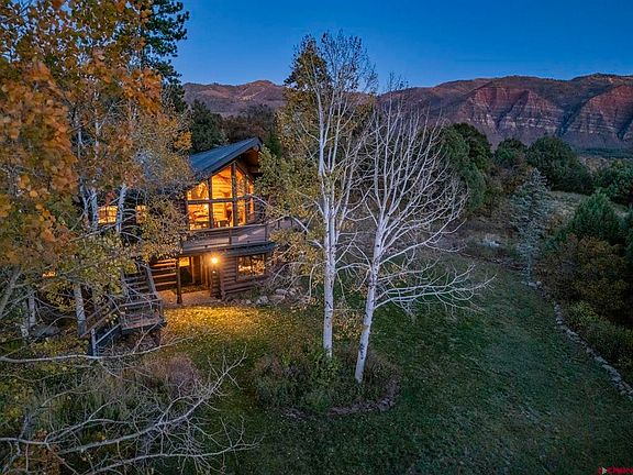 Set on three private acres between Durango and Purgatory Resort, this beautifully crafted log home captures the essence of Colorado mountain living. Nestled against dramatic red rock cliffs with sweeping mountain and valley views, it offers warmth, craftsmanship, and a seamless connection to nature in every direction. Inside, you’ll find three spacious bedrooms, three bathrooms, and inviting living areas that blend comfort with rustic elegance. The living room features soaring log-beam ceilings, panoramic windows, and a stunning stone fireplace that anchors the space in mountain charm. A cozy family area with a gas freestanding fireplace adds to the home’s welcoming ambiance. The main-level primary suite opens directly to the deck, while the lower level includes two additional bedrooms and a large art studio or recreation room—perfect for guests, hobbies, or relaxation. A private office with glass doors leading outside provides an inspiring work-from-home setting. The kitchen showcases tile-granite countertops, a generous island, and an open layout that flows naturally into the dining and living areas, all framed by breathtaking views. Nearly every room on the main level opens to an expansive 2,000+ sq ft deck—ideal for entertaining, soaking in the hot tub, or stargazing under Durango’s clear night skies. Additional highlights include a heated 720 sq ft workshop with an extra 312 sq ft of non-heated space, paved access, no covenants, and proximity to national forest trails and Purgatory Resort. The fenced garden with raised beds is perfect for those seeking a self-sustaining lifestyle surrounded by nature. Furniture is negotiable. Since 2021, thoughtful improvements have enhanced both the home and property. Fire mitigation, grading, and landscaping introduced native grasses, wildflowers, and mature spruce and aspen trees. Upgrades include a Generac whole-house generator, new asphalt driveway, split-rail fencing, cedar decks, log railings, and stone walkways that flow gracefully around the home and garden. The workshop was improved with insulation, lighting, a propane heater, and two roof extension for covered storage. Additional updates include a retaining wall for improved drainage, fresh exterior paint, a radon mitigation system, a new soaking tub, and updated kitchen appliances. A shared road maintenance agreement with neighbors ensures year-round access, with an annual fee of $700.