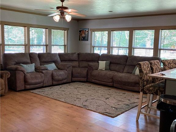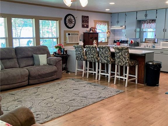 The home features an open floor plan with a spacious living and dining area, a nice kitchen with island seating, and expansive windows that provide abundant natural light and beautiful views of the surrounding trees. Whether you're looking for a weekend getaway, a full-time residence, or an investment property, this home offers flexible possibilities.