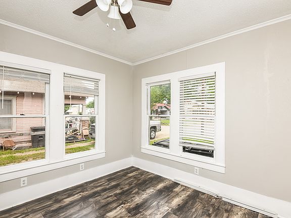 Inside, the living room features rich LVP flooring, fresh paint tones, and ample window light that highlights the original architectural trim. The dining area continues the home's blend of old and new, offering versatile space positioned near multiple windows for a bright, open feel. Just beyond, a second living or flex room connects to the backyard through French doors, adding even more layout flexibility.
