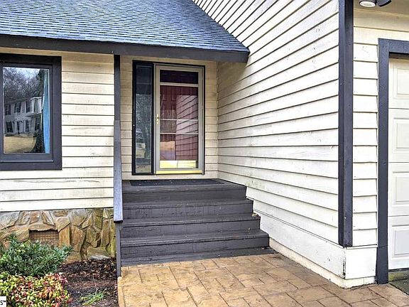 You will find tons of space and storage in this home. Four bedroom, two and one half bathrooms. This home is much larger that it looks from the outside. Huge family room with ceiling to floor brick fireplace (never used by seller) & not warranted but worked when it was purchased. High cathedral ceiling. Kitchen is good size with quartz countertops, black stainless appliances and restaurant type shelving & prep top. Kitchen and dining room & foyer have new dark wide plank hardwoods. off the dining room is a sunroom with skylights and many windows that overlook wooded yard that backs to vacant land. There is also a screened porch for your enjoyment as weather permits underneath is covered deck. The master is on the main floor and has two walk in closets. The master bath is very large with separate area that boasts one vanity and the other vanity is in main bathroom along with deep jetted tub, great for soaking! Separate shower comes with seat. Water closet allows for privacy. Upstairs you will find three more bedrooms and bonus room. The bonus could be fifth bedroom and has closet. Be sure and check it out, lots of storage potential here! Two of the additional bedrooms are extra large and all have good closets. This home is open and bright. Sitting on .74 acre wooded lot in well established neighborhood Riverside school district. Minutes to downtown Greenville & Greer. Restaurants, shopping, medical, airport and interstate access close by. Home warranty provided. Tall crawl for extra storage. Seller updates are Roof 2019, new carpet, new hardwoods, new laminate and some new paint. Over 2700 square feet (per previous appraisal) Great space, great buy! Make your appointment today!!