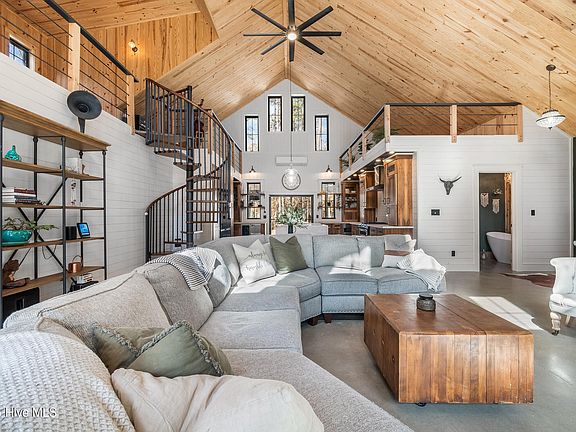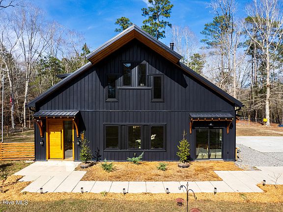 Located minutes from downtown historic Edenton, this stately home is situated in a private wooded community offering nature at its best. An engineered open-span structure with black exterior siding/roofing and red cedar accents, the home captures you yet melts into its environment of mature hardwoods.