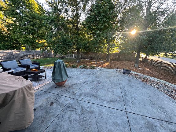 Large stamped patioFenced backyardCorner lotMature treesApple treesMulberry tree
