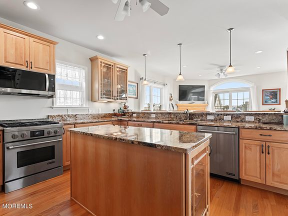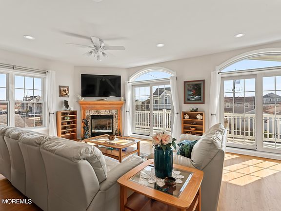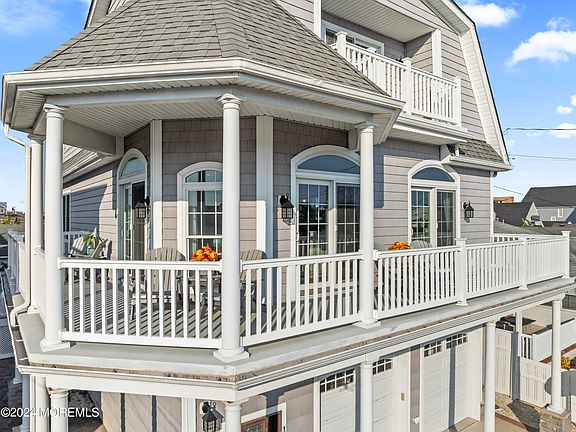 This beautifully crafted, like-new 4 bedroom, 4 bathroom home is a coastal oasis that perfectly blends luxury and beachy comfort. Nestled between the ocean and the bay, this stunning 3-story custom home offers modern amenities and high-end finishes. An elevator services all three levels for effortless access, while a chandelier with a winch and remote-controlled Hunter Douglas blinds over the stairs add convenience and elegance. Equipped with a whole-house Generac generator, tankless hot water htr and new sliding glass doors showcasing breathtaking ocean and bay views. This home is designed for all seasons. The interior features rich hardwood floors, recessed lighting, and an open-concept living area with a gas fireplace. The modern kitchen boasts stainless steel appliances, granite countertops, and custom cabinetry. The first-floor has 1 bedroom, currently used as an office, a full bath, wet bar, and sliders to the Trex deck. On the second floor you will find another bedroom and an open floor plan, while the third floor holds two more bedrooms, including a master suite with a fireplace, balcony, walk-in closet, and en suite bathroom. The two-car garage is immaculate with custom storage. The location is ideal and close to beaches, restaurants, and Island Beach State Park. This home offers luxury living with stunning views in a serene setting.