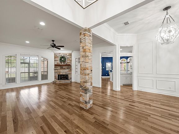 The primary suite is tucked privately at the back of the home, overlooking the backyard. It features a spacious walk-in closet and a spa-like bath with soaking tub, separate shower, and dual vanities. Two front bedrooms share a full bath and offer flexibility for family, guests, or office space. A fourth bedroom, located near the second living room and the well-appointed laundry room with a third full bath freshly renovated, is perfect for guests, teens, or a home office.