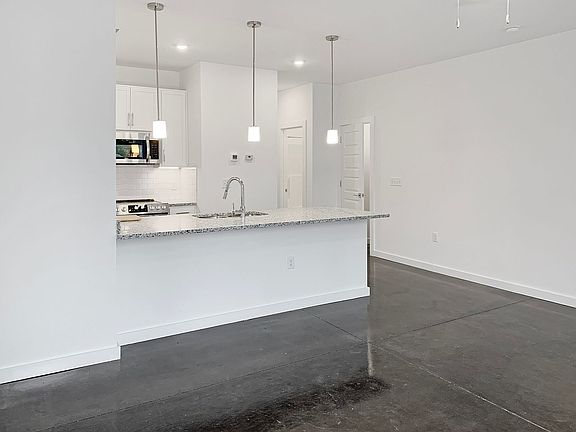 The unit features beautifully finished concrete floors throughout. The spacious family room is bathed in natural light and flows seamlessly into the kitchen, which boasts stainless steel appliances, large island, plenty of cabinets for storage and a convenient stackable washer/dryer.