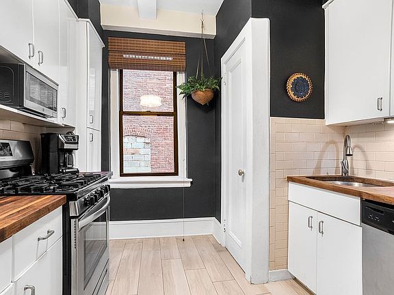 Your living room is generous in size with space for a dining table. The fully renovated, windowed kitchen features stainless steel appliances, and gorgeous butcher block countertops.