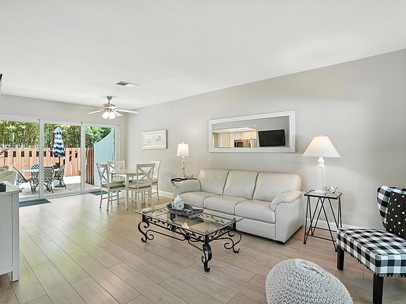 Nestled on a lushly landscaped corner lot, this thoughtfully designed two-bedroom, two-bath residence seamlessly blends modern sophistication with classic beachside comfort. The open-concept living space features rich hardwood flooring, tastefully curated furnishings, and an abundance of natural light pouring in through expansive windows and glass doors.