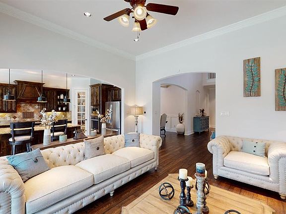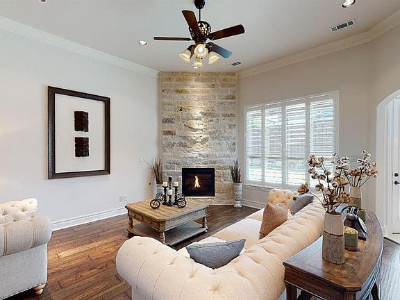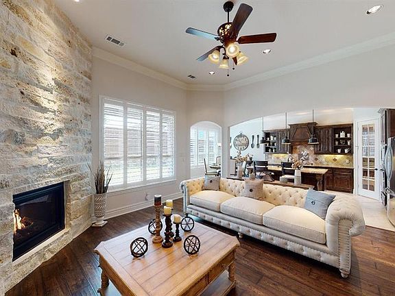 NO MUD OR PID! No detail has been overlooked in this immaculately crafted 2-story in Saddle Creek with beautiful brick and stone elevation! Second bedroom down is perfect for guests! Upgrades and amenities throughout include rich hardwood flooring, extensive crown molding, coffered ceilings, decorative lighting fixtures, plantation shutters, tons of storage, floor-to-ceiling stone FP, and MORE! Gourmet kitchen boasts granite countertops with tumbled stone backsplash, island with breakfast bar and pendant lighting, SS appliances, gas cooktop with custom vent hood, and cozy nook. Luxurious master bath with jetted tub and his & hers vanities. Game and media rooms upstairs make entertaining a breeze! Huge backyard!
