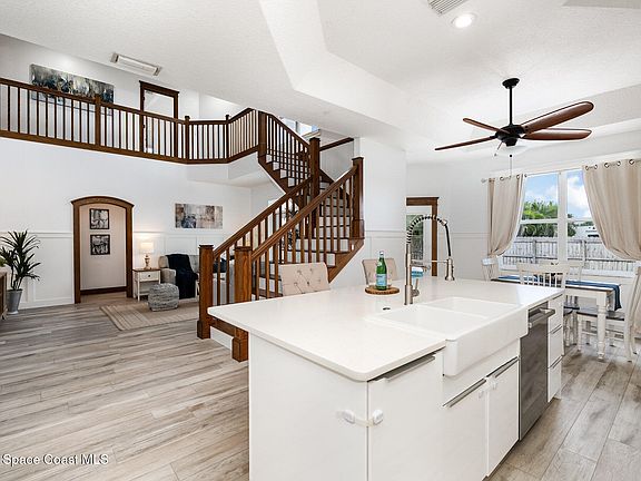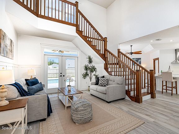 This custom 5-bedroom, 4-bath home sits on 1/3 of an acre and offers more privacy than most, tucked away on a quiet cul-de-sac. Step inside to soaring ceilings and an open floor plan with views of the stunning pool area. Three bedrooms feature their own ensuite bathrooms, while upstairs offers two balconies with gorgeous views from both sides of the home. Throughout the house, there is beautiful woodwork with stunning banisters leading upstairs, along with a breezeway that overlooks the living room. The massive backyard is perfect for all kinds of activities and an excellent spot to watch shuttle launches. Just a short stroll takes you to the community dock, where you can enjoy breathtaking sunsets and watch dolphins play in the Indian River. For even more outdoor fun, Rotary Park is only minutes away by car, with expansive grounds for the whole family to enjoy.