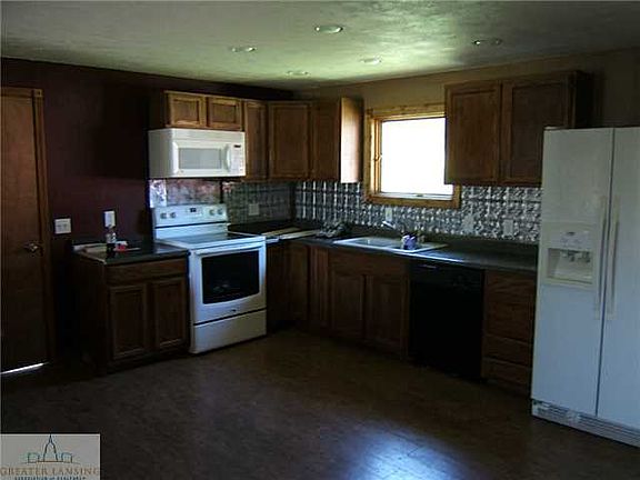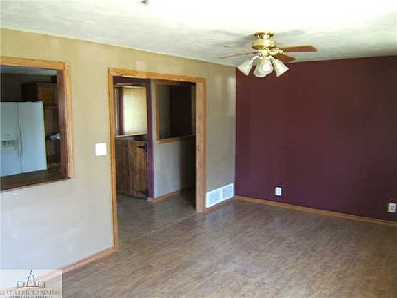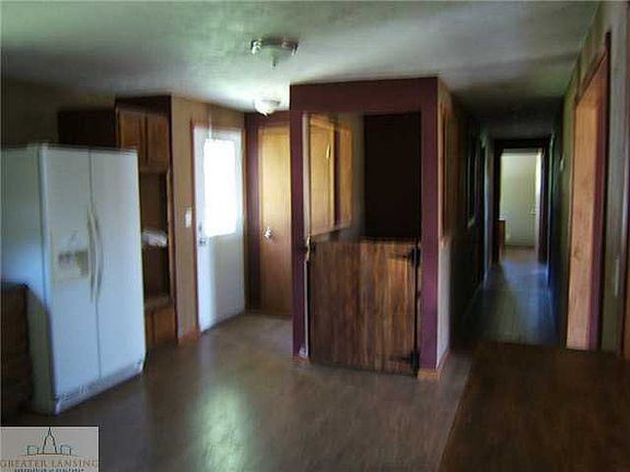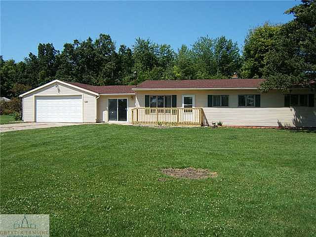 3 bdrm, 1.5 bath, 1200 sq ft ranch with 2.5 car attached garage, 30x40 pole barn with concrete floor on approx. 5.1 wooded acres between DeWitt and St. Johns.
