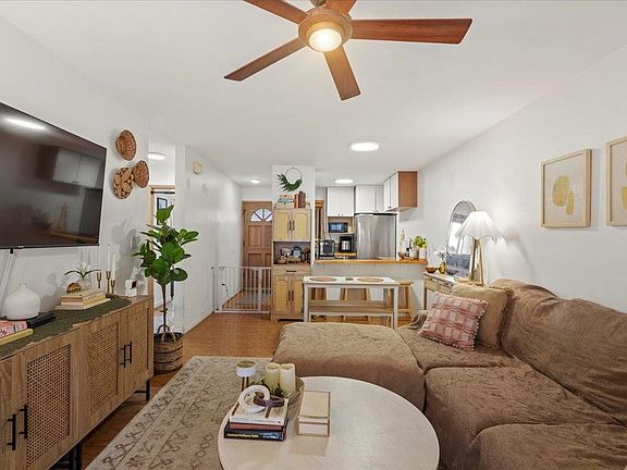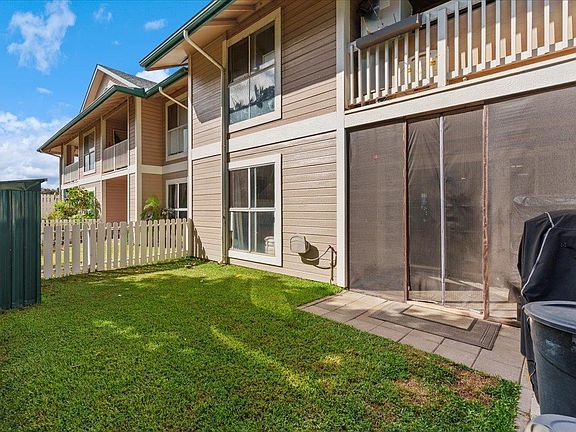 Exceptional Priced 2 bed 2 bath, seller invites all offers and will credit a generous incentive of $10,000 towards buyers closing-cost with accepted offer. Updated interiors feature neutral tones and easy-care wood laminate flooring. The kitchen shines with stainless appliances, butcher-block counters, and bar seating that opens to the living room—great for everyday living and entertaining. Hall bath has an upgraded walk-in shower with glass doors. The private primary suite sits quietly at the back, overlooking your own yard. Enjoy seamless indoor/outdoor life with a spacious lanai, new white picket fence, and lush green space for gardening, pets, or keiki playtime. Bonus storage above the lanai, an exterior storage room, and two front-row parking stalls add everyday convenience. Value, comfort, and function in one. Schedule a showing with your favorite REALTOR® today.