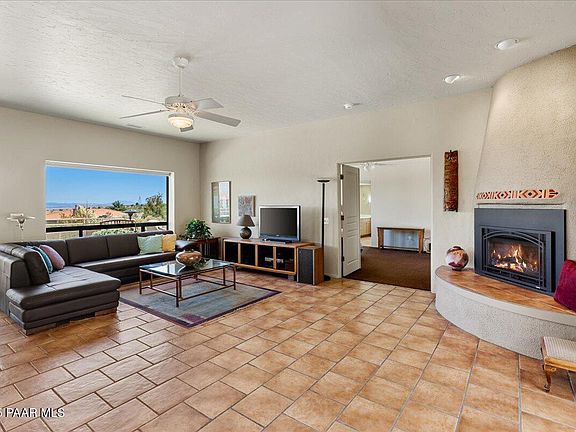 This beautifully maintained 2 bed, 2 bath Santa Fe-style poly-steel home offers warmth, character, and modern comfort. Featuring a remodeled kitchen with quartz countertops, rich hickory cabinets, and under-cabinet lighting, it's perfect for entertaining or everyday living. Relax in the inviting living room with a cozy gas fireplace, or unwind in the private covered back patio surrounded by mature landscaping and sweeping views. The spacious guest bedroom is ideal for visitors,with a spacious bathroom including a rejuvenating Jacuzzi tub. Additional highlights include a 3-car garage with an RV bay, newer roof,full exterior synthetic paint, wide handicap-accessible doorways, and a large safe that can convey.