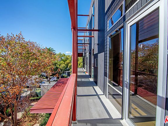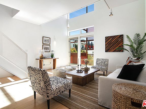 Architectural 2-bedroom, 3-bathroom top-floor townhouse designed by renowned architect Lorcan O'Herlihy. Expansive floor-to-ceiling windows, soaring ceilings, and an open-concept layout flood the home with natural light and frame sweeping views of the Hollywood Hills and Formosa Park. The spacious living and dining area, including a dry bar and wine fridge, flows effortlessly into a sleek modern kitchen featuring stone countertops, bar seating, stainless steel appliances, recessed lighting, and abundant cabinetry. Off the kitchen, a versatile office/flex space with built-in shelving is complemented by a powder bath. Upstairs, the primary suite offers a walk-in closet with custom cabinetry, Hollywood Hills views, and an ensuite bathroom with a walk-in shower. A second loft-style bedroom features a custom built-in closet, its own ensuite bath with a shower/tub combo, and access to the private Trex rooftop deck where panoramic city and mountain views capture the essence of L.A. living, from the Hollywood Sign to Griffith Observatory. Additional highlights include central AC/heat, automatic window shades, two assigned parking spaces with an EV charger, three guest parking spaces, and 24-hour access to Formosa Park. This architectural gem embodies the vibrant lifestyle that defines West Hollywood, just moments from the city's best shopping, dining, and entertainment.